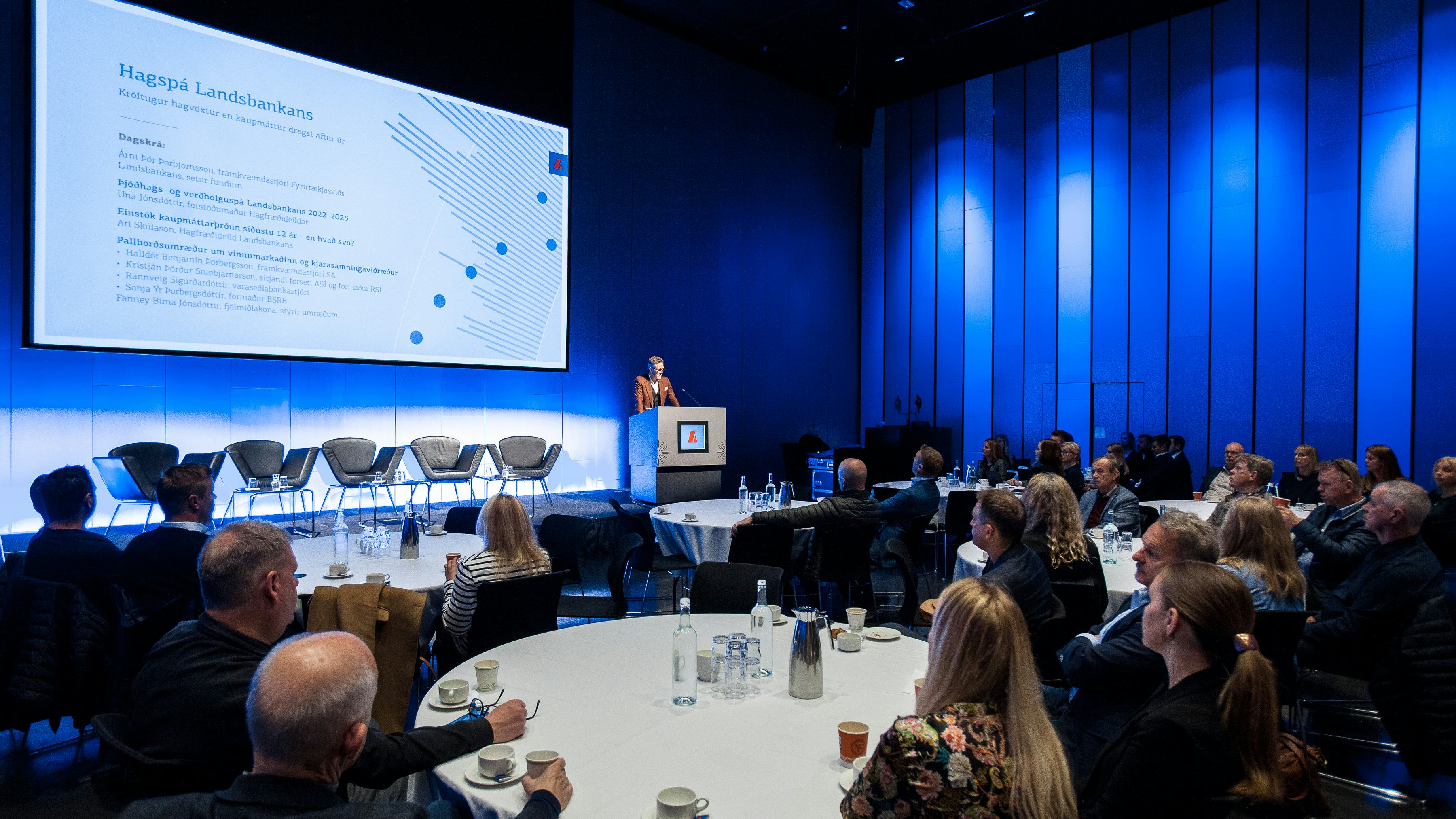 Kjarasamningar eru einn af stóru óvissuþáttunum í hagspánni og í erindi Ara Skúlasonar, hagfræðings í Hagfræðideild, var kastljósinu beint í þá áttina. Ari sagði að þróun launa og kaupmáttar á síðustu árum hefði verið verulega góð. „En í þessum heimi eru menn mjög lítið fyrir að tala um góðan árangur og hæla sér fyrir hvað það hafi gengið vel. Neikvæða umræðan er yfirleitt algengari en sú jákvæða,“ sagði Ari. Frá upphafi árs 2010 fram í júní 2022 hefði kaupmáttur aukist um rúmlega 50%. Hrunið árið 2008 hefði vissulega reynst erfitt en í kjölfarið hefði vinnumarkaðurinn staðið mjög vel saman að því að bæta það sem illa fór.
