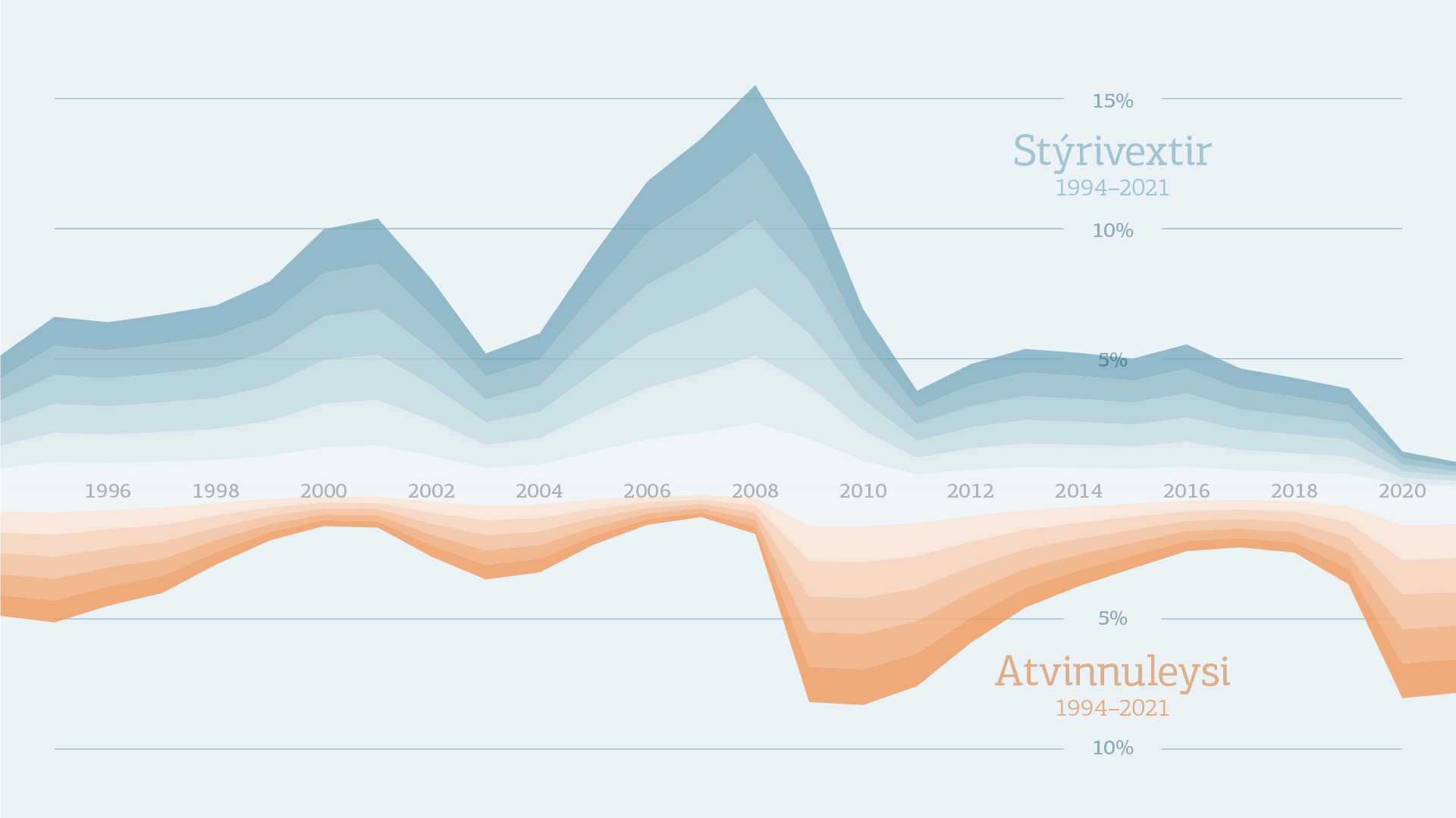 Atvinnuleysi hefur minnkað verulega frá því að skráð atvinnuleysi náði hámarki í 11,6% í janúar 2021. Atvinnuleysi var 5,0% í september og hefur því minnkað um 6,6 prósentustig frá því í janúar. Ráðningarstyrkir hafa leikið stórt hlutverk við að draga úr atvinnuleysi en tímabil þeirra eru nú farin að renna út. Fyrir framhaldið skiptir miklu máli hvort ráðningarsambönd vegna styrkja haldast áfram eða ekki. Heildarvinnustundum hefur nú fjölgað fimm mánuði í röð, en þeim tók að fækka í upphafi ársins 2020, um svipað leyti og faraldurinn brast á.