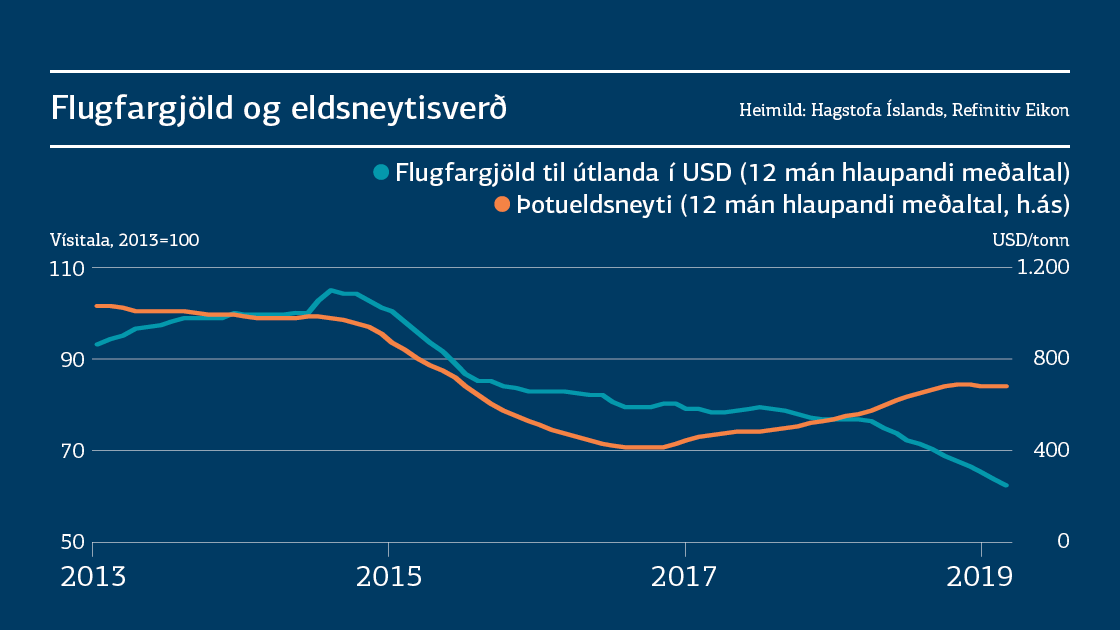 Flugfargjöld til útlanda, eins og Hagstofan mælir þau í vísitölu neysluverðs, hafa lækkað mikið síðan 2014. Framan af lækkaði þotueldsneyti samhliða lækkun flugfargjalda. Frá 2016 hefur verð á þotueldsneyti hins vegar hækkað verulega á sama tíma og verð á flugmiðum hélt áfram að lækka.