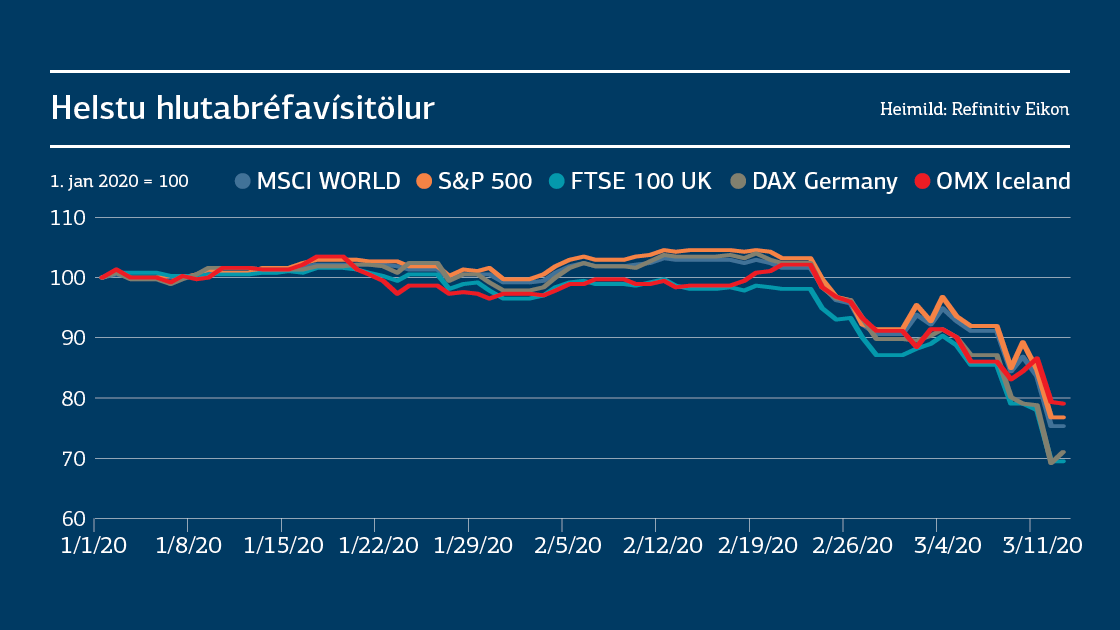 Hlutabréfavísitölur um allan heim lækkuðu verulega í síðustu viku. Meðal annars hefur MSCI-heimsvísitalan lækkað um 25% síðan um áramót, S&P 500 um 23% og FTSE 100 um 31%. Þá voru viðskipti í kauphöllinni í New York stöðvuð nokkrum sinnum í síðustu viku, en viðskipti stöðvast sjálfkrafa í 15 mínútur ef S&P 500 vísitalan lækkar um 7% innan dags. Þetta er í fyrsta sinn síðan 1997 sem viðskipti stöðvast af þessum ástæðum.