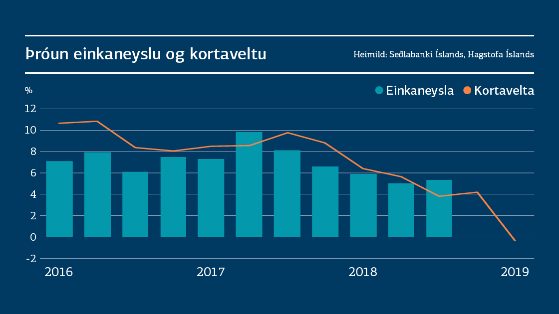 Velta innlendra greiðslukorta dróst saman um 0,4% að raunvirði milli ára í janúar. Þetta bendir til þess að heimilin séu farin að halda meira að sér höndum með neyslu. Opinber umræða frá því í haust bendir til þess að yfirvofandi gætu verið meiri átök á vinnumarkaði en sést hafa um áratugaskeið. Slíkt ástand líkt og önnur óvissa virkar almennt neysluletjandi á heimilin.