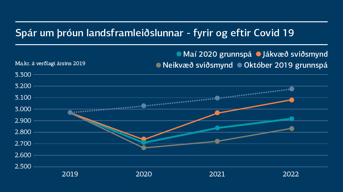 Samkvæmt þjóðhags- og verðbólguspá sem við birtum í seinustu viku mun landsframleiðsla dragast saman um tæplega 9% á árinu 2020 vegna áhrifa af Covid-19. Samdráttarskeiðið verður stutt og er gert ráð fyrir að á næsta ári verði hagvöxtur 5% og 3% árið 2022. Það verður seint lögð of mikil áhersla á að óvissa er gríðarlega mikil á þessum fordæmalausu tímum, bæði hvað varðar þróun faraldursins sjálfs og efnahagslegar afleiðingar hans. Í grunnspá okkar gerum við ráð fyrir að efnahagsbatinn hefjist á seinni helmingi ársins samhliða því sem faraldurinn gengur niður án þess að verulegt bakslag komi í baráttuna gegn veirunni. Þar er þó engan veginn á vísan að róa. Í ljósi þeirrar miklu óvissu sem nú ríkir höfum við því þróað tvær sviðsmyndir samhliða grunnspánni. Í annarri þeirra er gert ráð fyrir talsvert neikvæðari þróun, að veiran blossi upp að nýju eftir að fyrsta bylgjan er um garð gengin. Efnahagsbatinn fer því seinna af stað og verður töluvert veikari á næsta ári en gert er ráð fyrir í grunnspá. Við birtum einnig bjartsýnni sviðsmynd þar sem gert er ráð fyrir hraðari efnahagsbata í heiminum og sterkari eftirspurn í helstu viðskiptalöndum okkar. Sú sviðsmynd gerir ráð fyrir að þróun skilvirkrar meðferðar og/eða bóluefnis gegn Covid-19 gangi talsvert hraðar en nú er útlit fyrir.