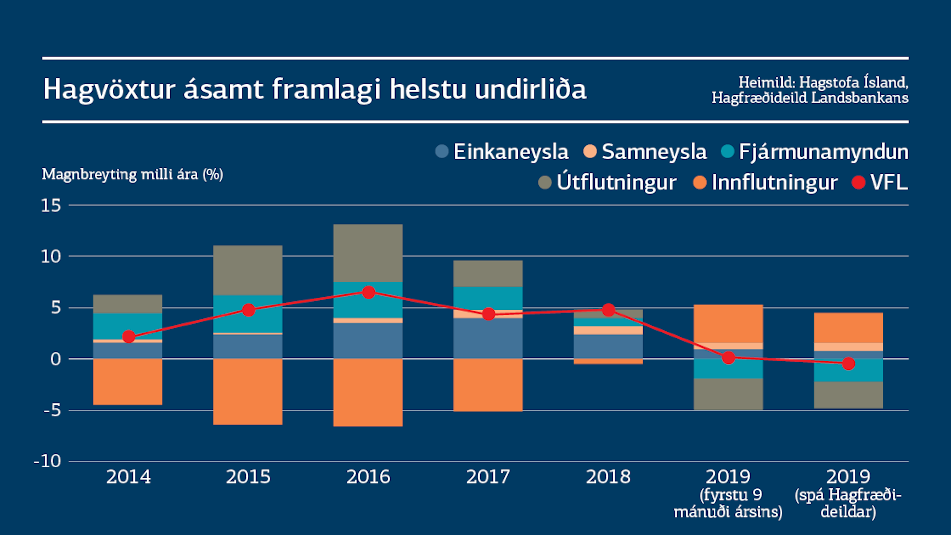 Eftir samfelldan hagvöxt frá 2011 til 2018 sjáum við fram á lítilsháttar samdrátt í ár. Samkvæmt þjóðhagsreikningum fyrir fyrstu 9 mánuði ársins mældist 0,2% hagvöxtur, en við spáum 0,4% samdrætti í ár. Framlag helstu undirliða til hagvaxtar á fyrstu níu mánuðunum er mjög svipað og við spáum fyrir árið í heild. Mesti munur á spá okkar og mælingu Hagstofunnar liggur í mun meiri samdrætti á innflutningi (-9,7%) en við búumst við fyrir árið í heild (-6,4%), en samdráttur á innflutningi kemur til hækkunar hagvexti.