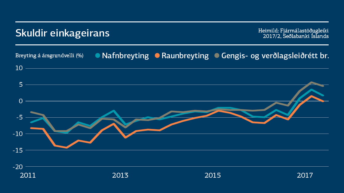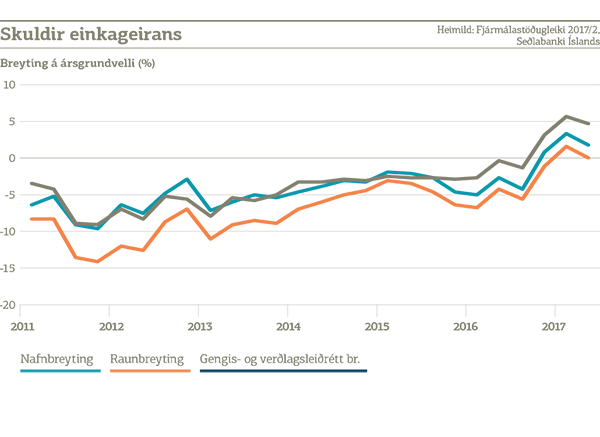 Á árunum 2011 til 2016 lækkuðu skuldir einkageirans, þ.e. heimila og fyrirtækja. Sem hlutfall af landsframleiðslu lækkuðu þessar skuldir um næstum helming, úr 300% af VLF í 160% af VLF. Í ár varð breyting þar á. Samkvæmt tölum Seðlabanka Íslands er einkageirinn aftur byrjaður að skuldsetja sig, í frekar litlum mæli þó.