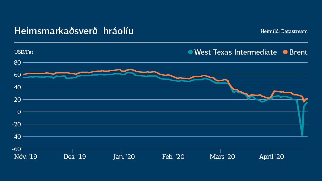 Í síðustu viku fór tunnan af West Texas Intermediate (WTI) olíu tímabundið niður fyrir núll. Um er að ræða framvirka samninga um afhendingu olíu í maí. Ólíkt t.d. framvirkum samningum með Brent-norðusjávarolíu eru opnir samningar með WTI ekki gerðir upp miðað við stundarverð heldur er olían afhent í Cushing, Oklahóma. Þegar í ljós kom að allir tankar voru fullir áttu þeir sem voru með opna samninga um að kaupa olíu engan stað til að geyma olíuna og neyddust til að borga með olíunni til þess að komast út úr samningunum.