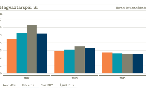Seðlabankinn hefur lækkað hagvaxtarspá sína fyrir árið 2017 um rúmt eitt prósentustig. Skýrist það aðallega af minna framlagi utanríkisviðskipta þar sem horfur eru á hægari vexti í þjónustuútflutningi og hraðari vexti innflutnings. Bankinn hækkaði aftur spá sína um einkaneyslu og fjárfestingu fyrir þetta ár. Breytingar á spám um hagvöxt á næsta og þarnæsta ári voru lítilsháttar. Verðbólguhorfur eru að mestu svipaðar og í spánni frá því í maí, að mati bankans.