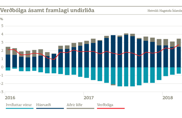 Síðustu misseri hafa tveir gagnstæðir kraftar togast á í verðbólguþróun hér á landi, húsnæðisverð til hækkunar og innfluttar vörur til lækkunar. Það hefur lengi verið ljóst að hvorki svona miklar hækkanir á húsnæði né svona miklar lækkanir á innfluttum vörum geti haldið áfram endalaust. Dregið hefur úr framlagi þessara tveggja liða síðan síðasta sumar. Síðustu mánuði hefur hins vegar framlag húsnæðis til hækkunar verðbólgu haldist óbreytt á meðan framlag innfluttra vara til lækkunar hefur haldið áfram að minnka. Þetta er helsta skýring þess að verðbólgan fór yfir markmið núna í mars.