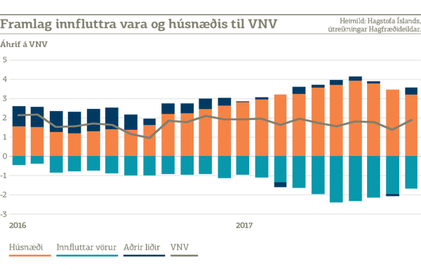 Síðustu ár hafa tveir gagnstæðir kraftar tekist á í verðbólguþróuninni; gengi krónu og húsnæðisverð. Styrking krónunnar, lítil erlend verðbólga og aukin samkeppni samhliða komu erlendra smásölufyrirtækja inn á markaðinn hafa unnið á móti miklum verðhækkunum á húsnæði. Þegar hæst lét í sumar var framlag húsnæðis 3,9 prósentustig til hækkunar, en framlag innfluttra vara 2,3 prósentustig til lækkunar. Við höfum áður bent á að hvorugt getur verið sjálfbært til lengri tíma. Í tölum Hagstofunnar, sem stofnunin birti á föstudag, voru nokkuð skýr merki um að báðir þættir eru byrjaðir að gefa eftir.