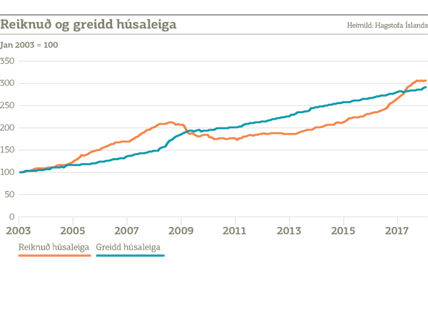 Sem hluti af útreikningi á vísitölu neysluverðs reiknar Hagstofan annars vegar kostnað við að búa í eigin húsnæði (reiknuð húsaleiga) og hins vegar kostnað við að leigja (greidd húsaleiga). Reiknuð húsaleiga er reiknuð út frá fasteignaverði og vöxtum á fasteignalánum á meðan greidd húsaleiga er reiknuð út frá þinglýstum leigusamningum. Eins og sést þá hefur kostnaður við að búa í eigin húsnæði og kostnaður við að leigja þróast með mjög ólíkum hætti síðustu ár.