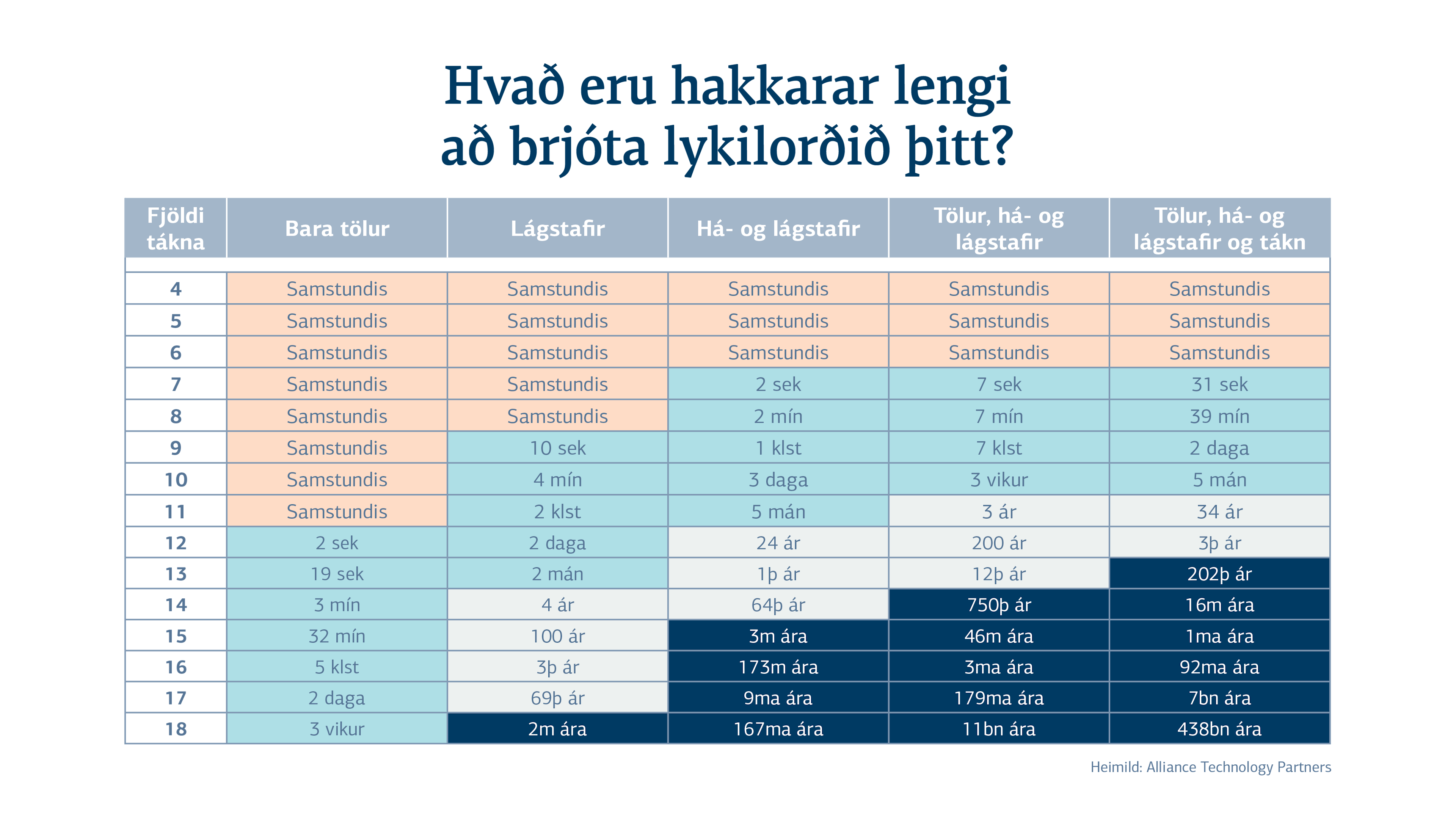 Lengd lykilorðs skiptir nefnilega meira máli en flækjustig upp á styrkleika. Með hverjum stafnum sem þú bætir í lykilorð eykst styrkleiki þess ótrúlega mikið. Þannig tekur það hakkara ekki nema klukkutíma að brjóta 9 stafa lykilorð úr hástöfum og lágstöfum en 3 milljónir ára að brjóta 15 stafa lykilorð úr sömu blöndu.